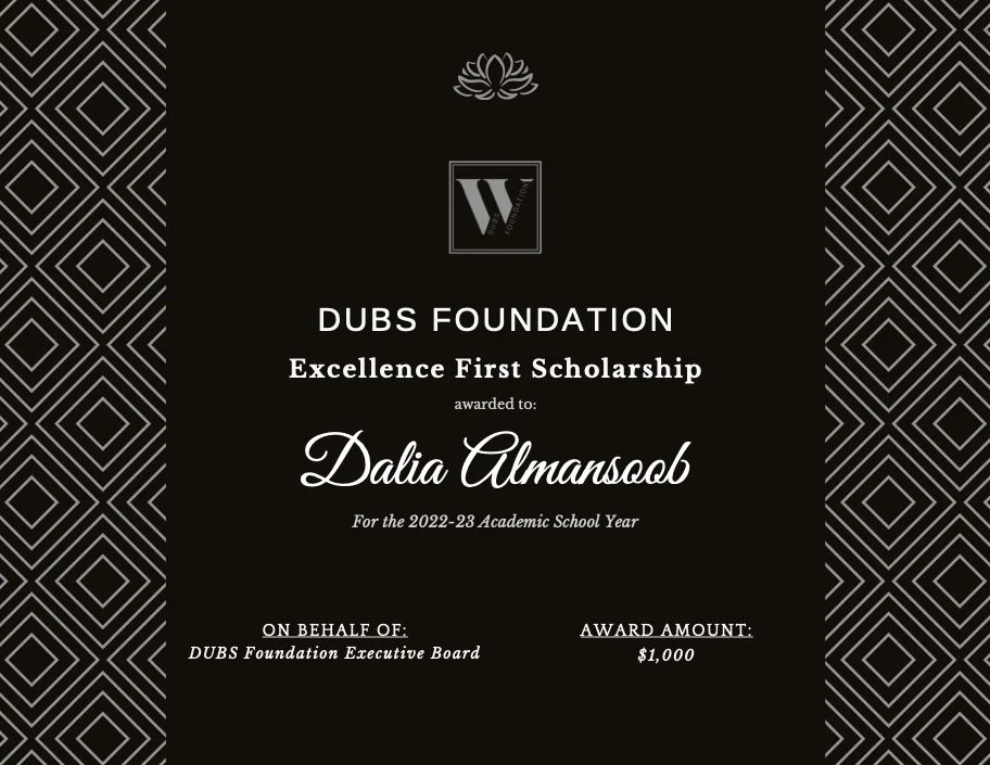“We are delighted to present Dalia Almansoob as one of our 2022 DUBS Foundation Excellence First Scholarship recipients. She is a bright student who illustrates unrelenting perseverance in all parts of her life. Dalia has a passion for language and cultural diversity and loves to connect with people through cuisine and conversation. Her artistic creativity is highlighted through both her high school involvement in the yearbook committee and her love for photographing nature. Fueled by her interest in healthcare, service, and science, she will be attending Samford University this fall with plans to become a pharmacist and focus on patient education. We are truly impressed by Dalia’s curiosity, reliability, and drive and look forward to seeing her thrive in college and beyond!” - written by Nadia Anabtawi